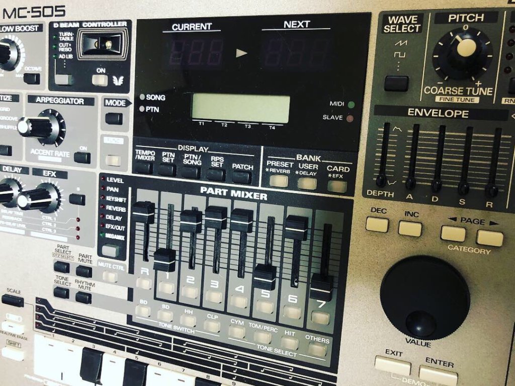 La MC-505 dispose d’un séquenceur multitimbral 8 parties. La première est dédiée à la rythmique (R) et se compose elle-même des 8 pistes de percussions. Les 7 suivantes contiennent des patches ou des kits. Chacune des 8 parties et 8 pistes de percussions possède une diode de statut (mute ou activité) et les 8 parties sont commandées en temps réel par les faders de la table de mixage. Le séquenceur est organisé en patterns (248 en ROM, 200 en RAM et 200 sur carte) et en songs (50 en RAM). La résolution est de 96bpqn (soit 384 à la noire, ce qui est suffisant) et la capacité interne est de 95 000 notes. Le double écran numérique 3 diodes 7 segments affiche le pattern en cours et le pattern d’enchaînement, celui-ci clignotant pendant la dernière mesure. L’enchaînement de 2 patterns est parfait, sans la moindre fluctuation.
