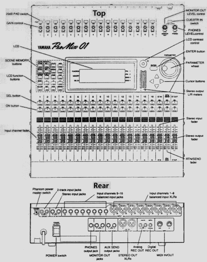 D’extérieur, la ProMix 01 se situe à mi-chemin entre une DMP7, une DMR8 ou une DMC1000, et une DMP11 ou une DMP9. Comprenez par là qu’à défaut d’autant de potentiomètres que de paramètres, elle s’apparente plus à une console qu’à un rack (encore qu’en lui rajoutant des cornières commercialisées par Yamaha en option, elle puisse occuper onze unités). Physiquement, chacun des seize canaux est accompagné d’un réglage de gain (-60/-16 dB), d’un pad d’atténuation (20 dB), d’une touche de sélection, d’une touche mute et d’un fader motorisé 60 mm (rapide à la détente).