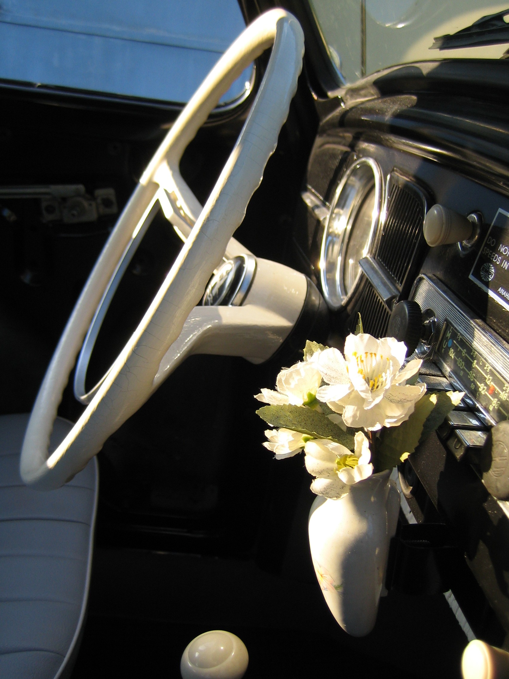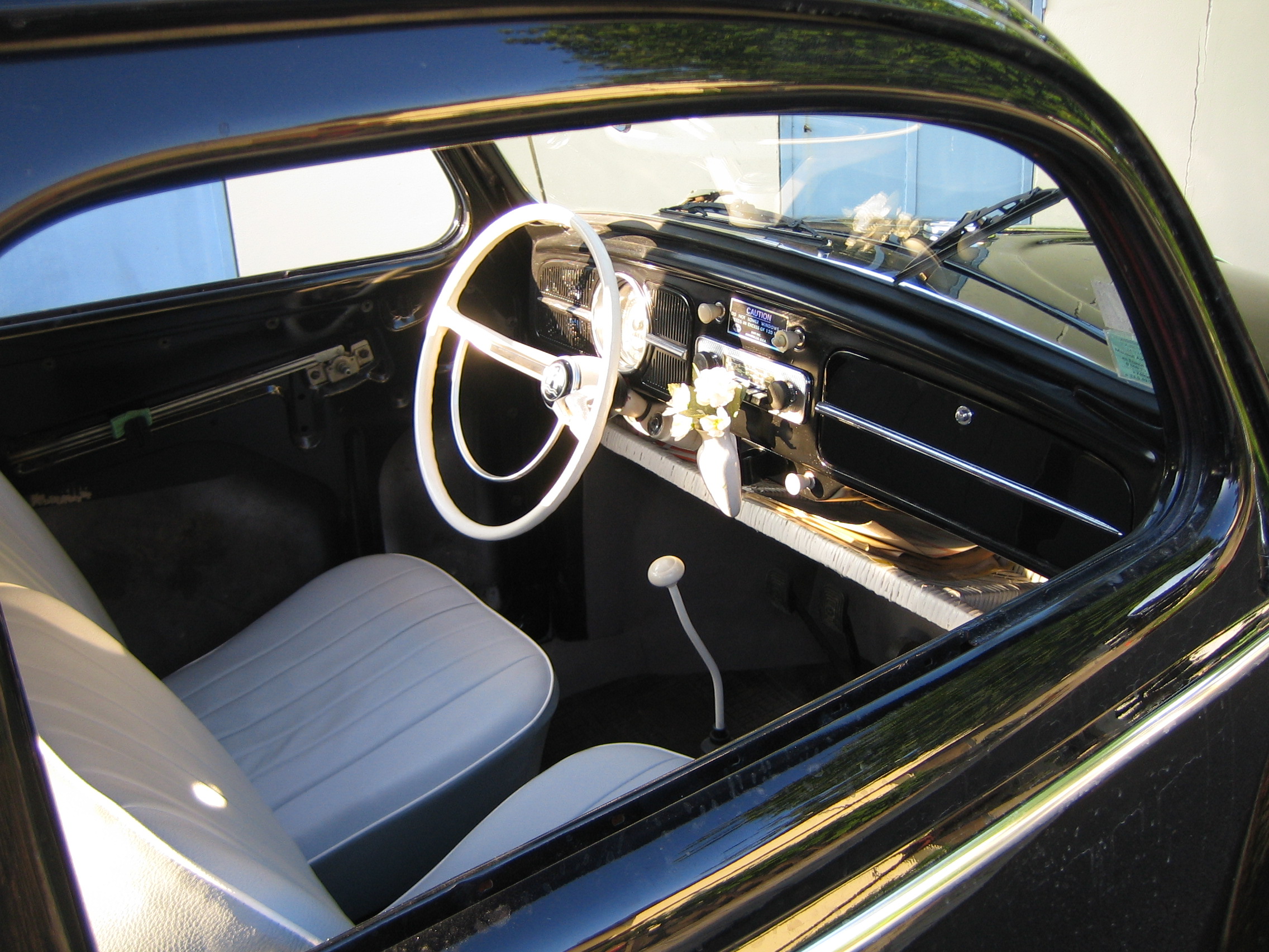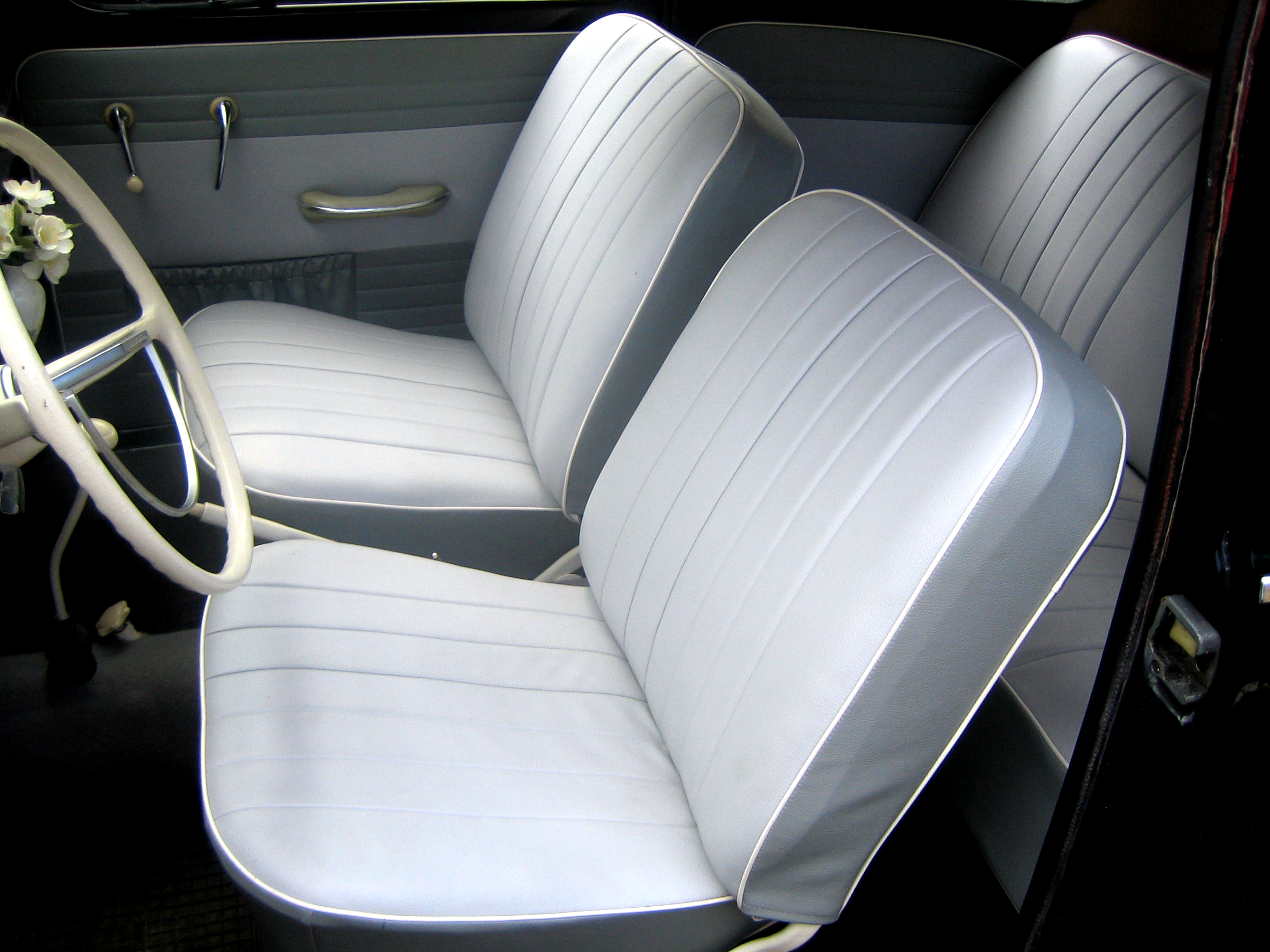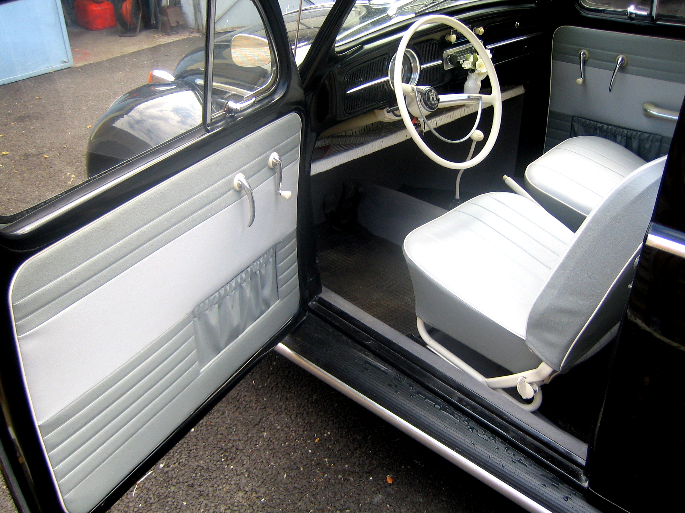 l’ intérieur est recouvert de housses blanches et semble en bon état d’origine…Deux auto-radios d’ époque seront fournis, un set de 4 pneus hivers, ainsi que les pièces d’ origine conservées dont le volant « style Ovale » remplacé par le modèle 1961 avec le demi-cercle.