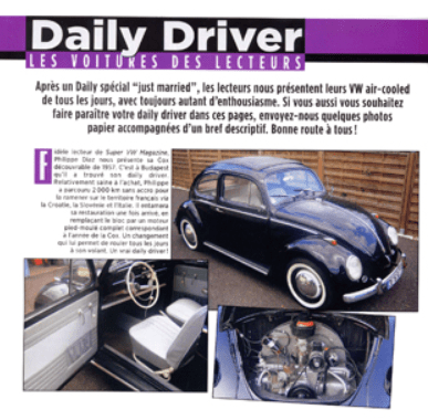 Je suis alors piqué par la volonté de respecter les caractéristiques de sortie d’usine de ma découvrable. Après des mois de travail et une nouvelle robe noire, ma voiture retrouve une superbe beauté. Elle remportera quelques trophées et un apparaitra dans mon magasine de chevet: Super VW Magasine.