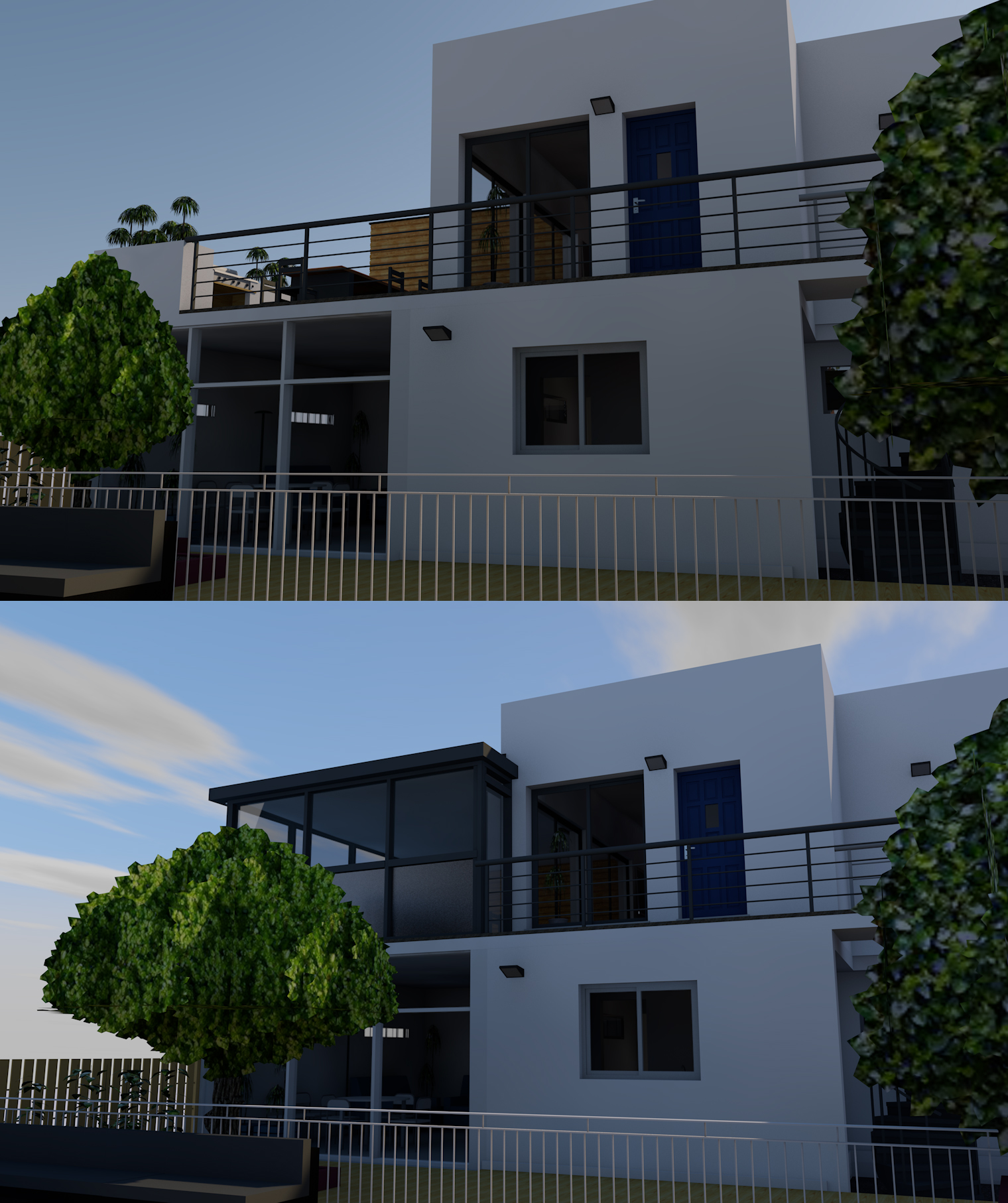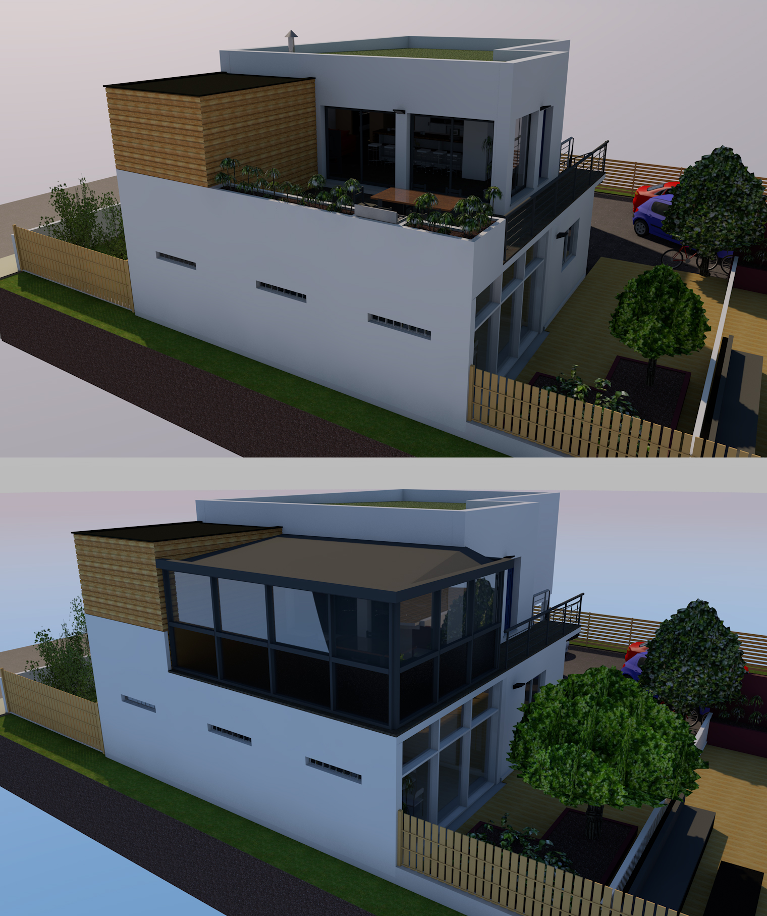 La maison remise sur pied, nous sommes forcés de constater que la terrasse à l’étage est peu utilisée dans l’année. Je reprends donc mes anciennes modélisations et y ajoute une véranda. Cette extension est vite votée et je recherche un fabricant installateur bien placé..